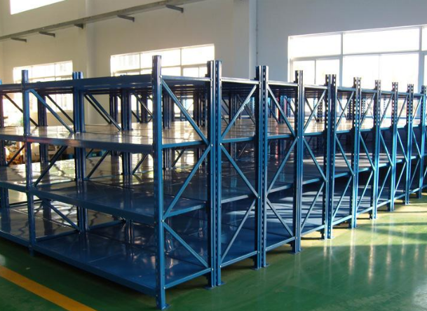 蓝色层板货架,中型货架,层板可自由调节高度,每层载重100-500公斤,可以根据要求定制。