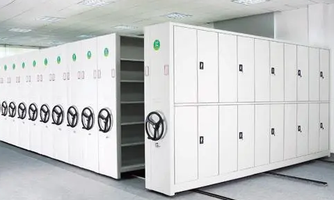 移动密集架下方有导轨,摇动手柄,密集架可以在导轨商移动,密集架
