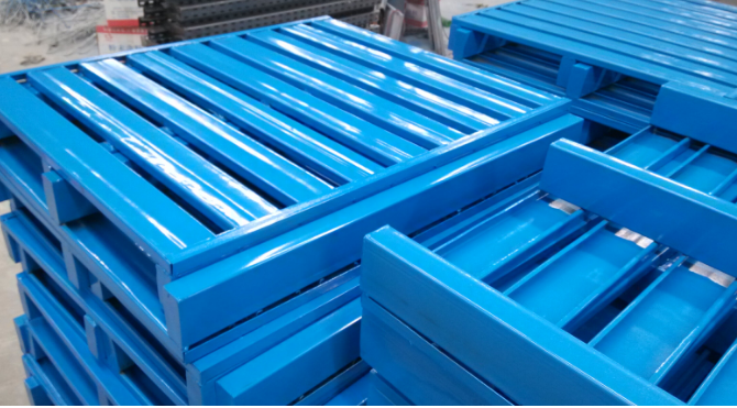 蓝色钢托盘,钢托盘可以定制,可以定制橘红色、浅灰色、黑色等。