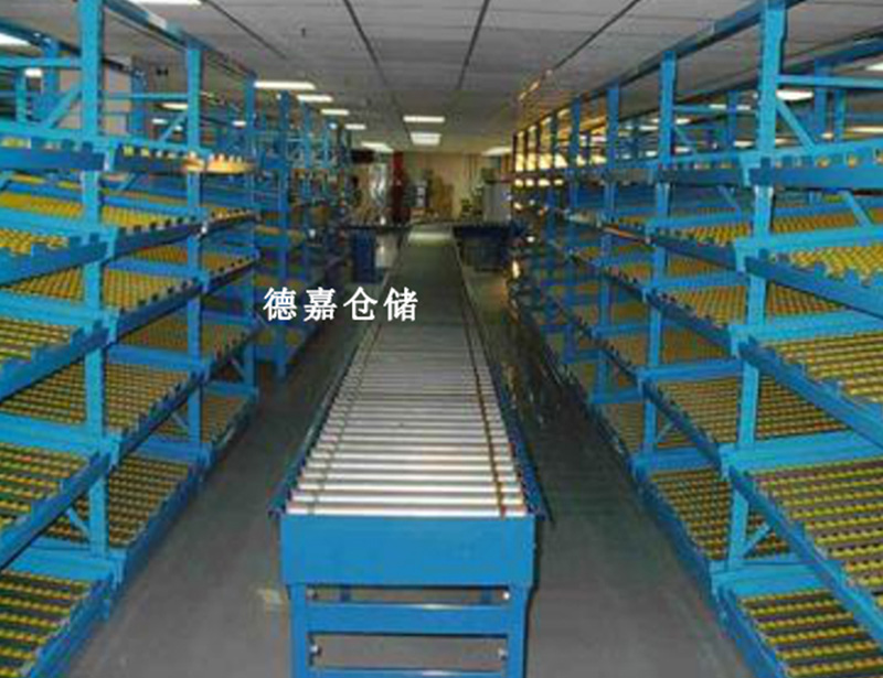 流利式货架特性:流利式货架通常由中型横梁货架演变而来,每层前后横梁之间以一定的坡度(约3°)放置滚轮式铝合金或流利条。货物通常用纸包装或放在干燥的塑料周转箱中,货物的流动和先进先出是通过自身重量来实现的。单位货架每层荷载一般小于1000kg,流利式货架高度小于2.5m。